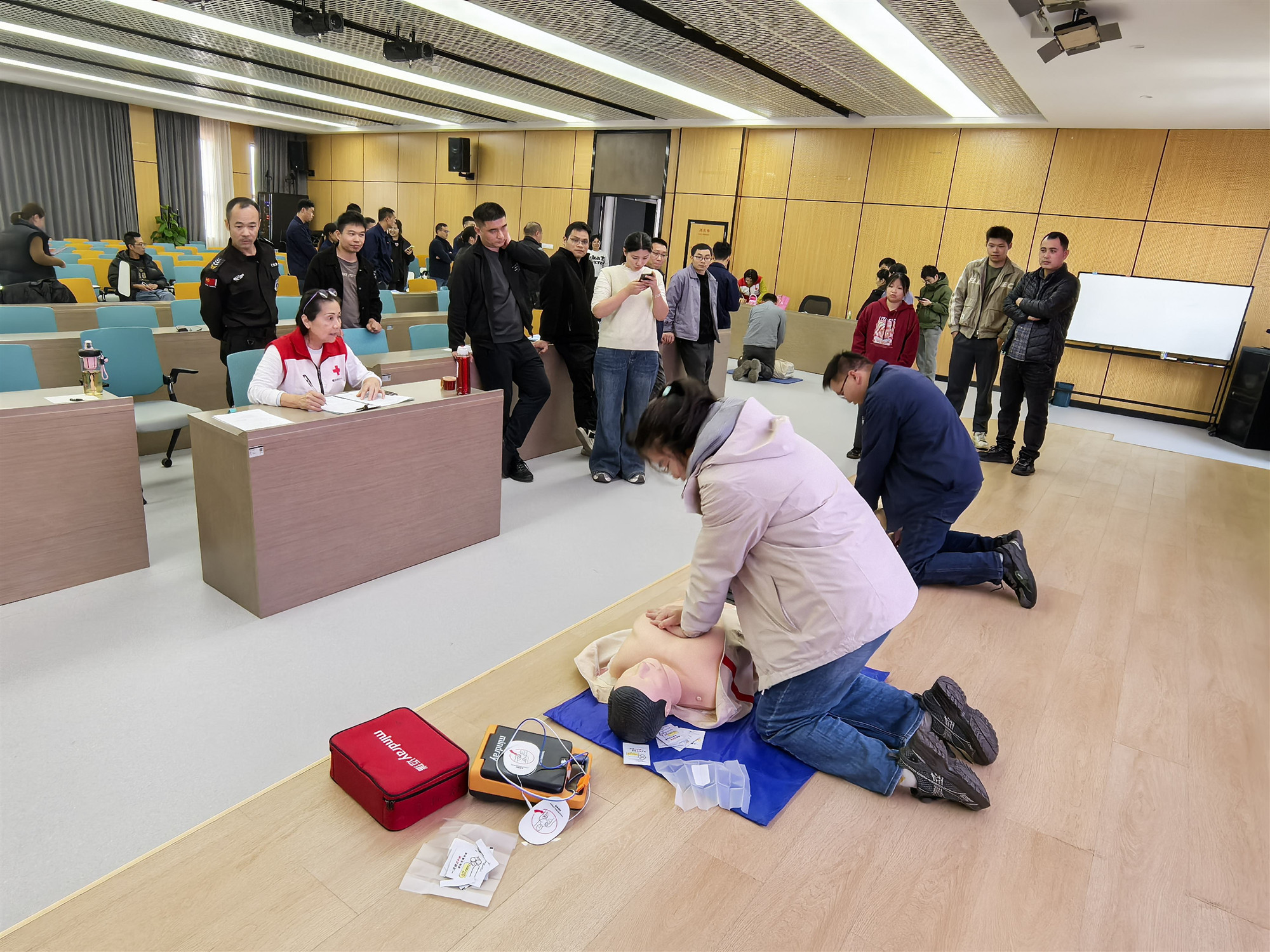 培训采用“理论讲解+实操演练+考核”的模式。资深师资们系统讲解了心肺复苏(CPR)的重要性、自动体外除颤器(AED)的使用原理、以及应对突发性心脏骤停的完整流程。在实操环节,学员们在师资指导下,利用模拟人教具反复练习胸外按压、人工呼吸及AED操作,确保动作规范、流程熟悉。培训现场学习氛围浓厚,互动积极。