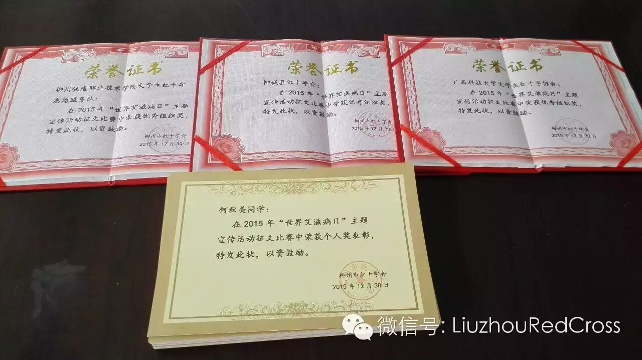 今年,在2015年“世界艾滋病日”系列宣传活动过后,市红十字会继续开展防治艾滋病主题宣传活动征文比赛。经各参赛单位评选、推荐,柳城县红十字会、广西科技大学大学生红十字协会及柳州铁道职业技术学院大学生红十字志愿服务队等3家单位获得优秀组织奖,廖彩莲等58人获得个人奖表彰。